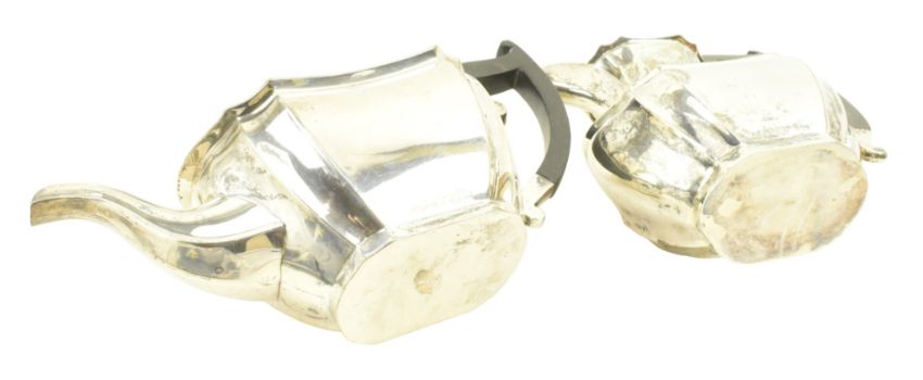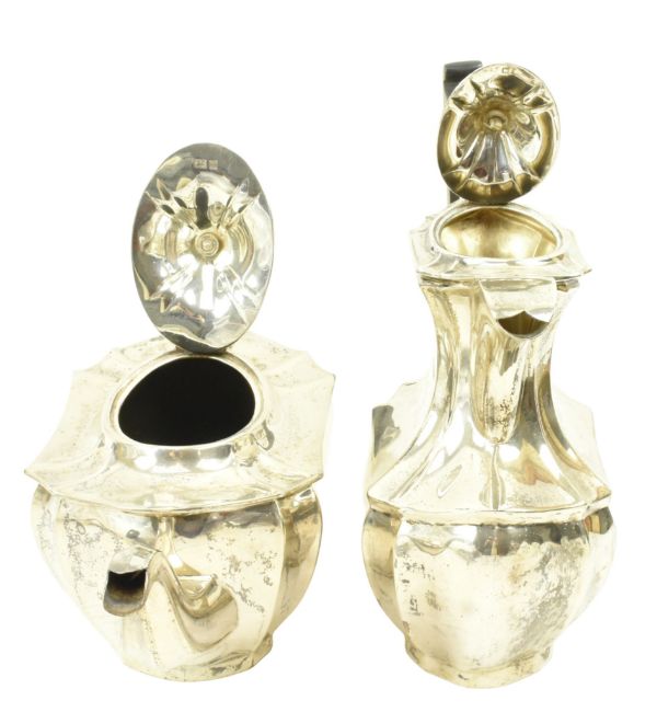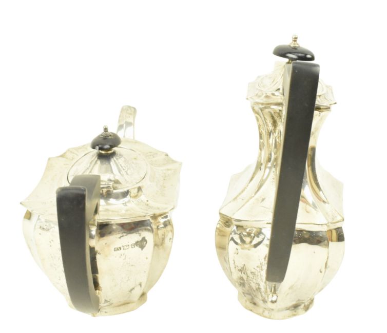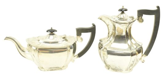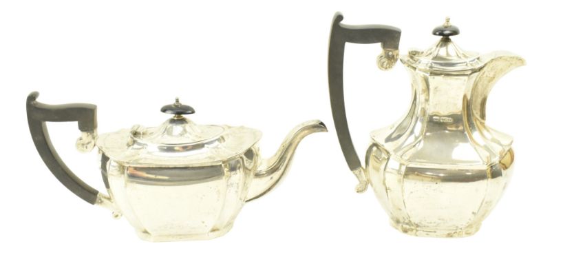 A 20th century George V hallmarked silver coffee pot & teapot. Each with insulated handles. Hallmarked year 1932, Sheffield & 1935, London. Sponsors mark for Viner's Ltd (Emile Viner). Total gross weight approx. 1317g.