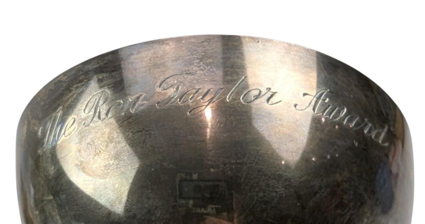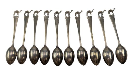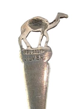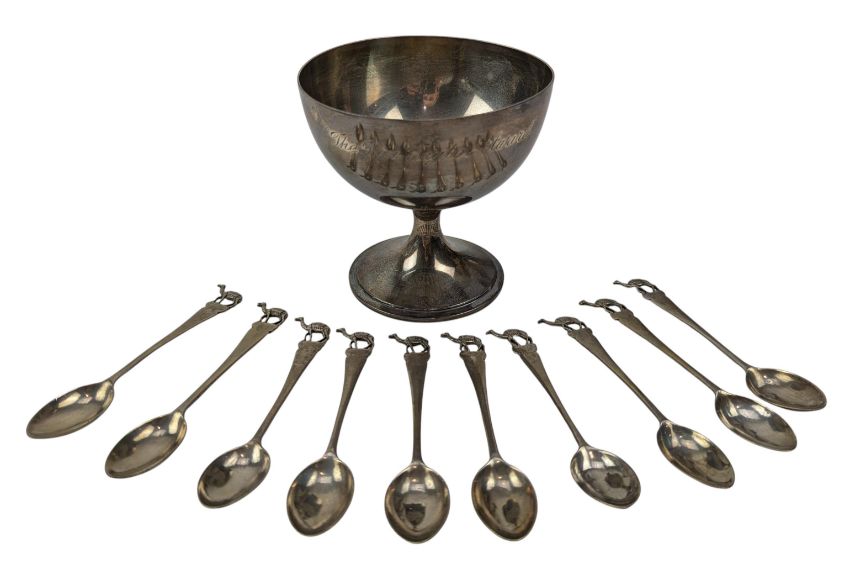 A 20th century George VI hallmarked silver trophy / footed bowl. Engraved 'The Ron Taylor Award' to the body. Hallmarked year 1938, London. Sponsors mark for Robert Pringle & Sons. Together with a set of ten Jerusalem silver teaspoons. Each handle having a camel atop decoration. Total weight approx 140g
