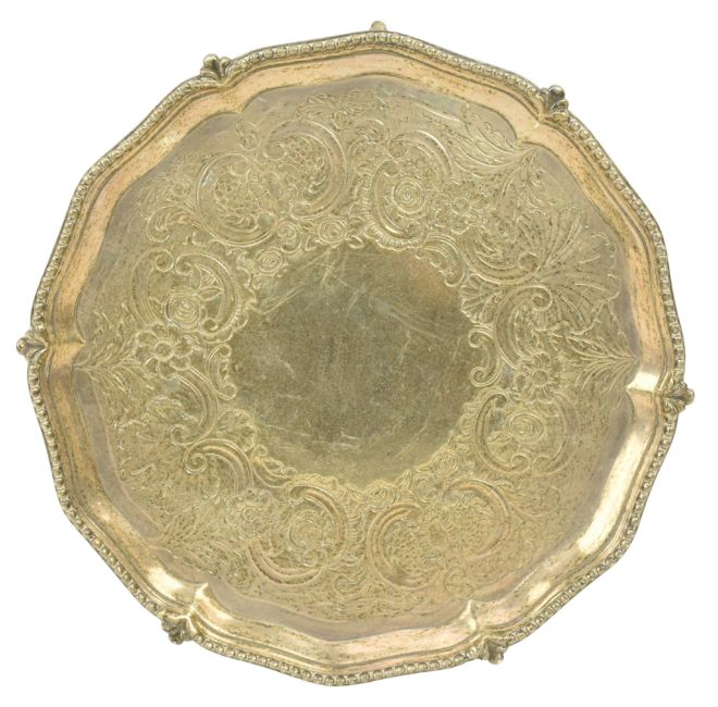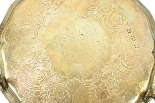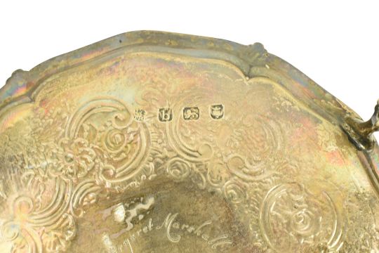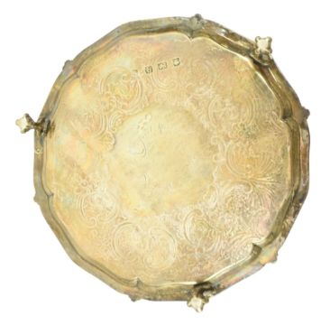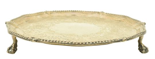 An 18th century George III hallmarked silver salver / card tray raised on claw and ball feet. Hallmarked year 1777 London. Sponsors mark for John Crouch I & Thomas Hannam. Engraved 'Arthur L and Margaret Marshall 1889'. Weight approx. 285g