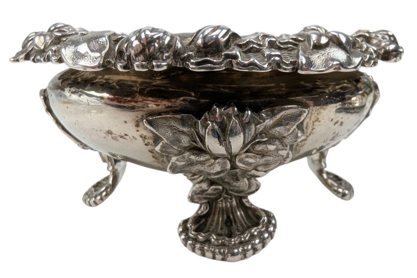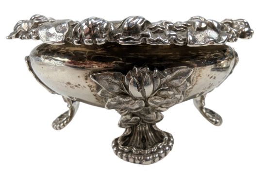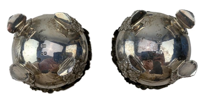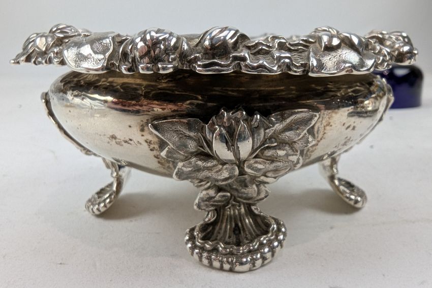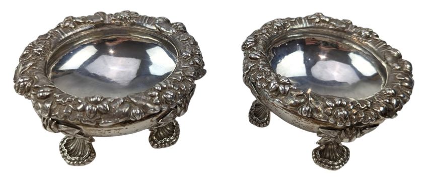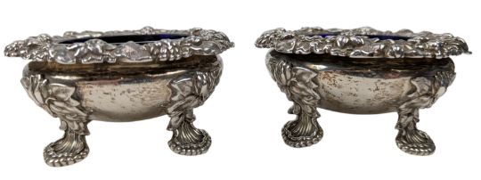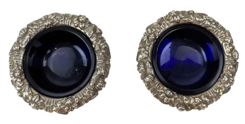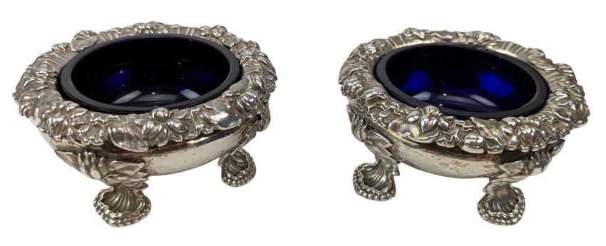 A pair of George IV hallmarked silver & blue glass lined table salts. Hallmarked year 1829, London. Sponsors mark for Edward, Edward junior, John & William Barnard (1829-1846). Weight approx 339g (excluding the blue glass liners).