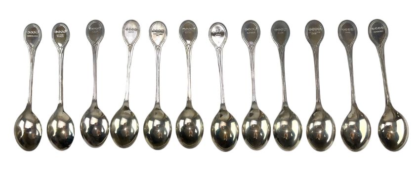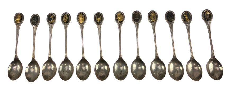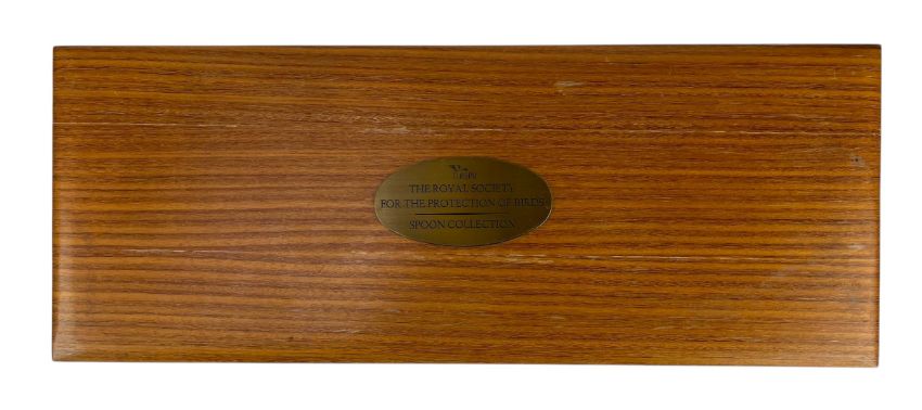 A cased / boxed set of six Elizabeth II hallmarked silver commemorative 'Herring Gull' souvenir teaspoons. Hallmarked year 1975, London. Sponsors mark for John Pinches (Medallists) Ltd. Total weight approx. 329g.