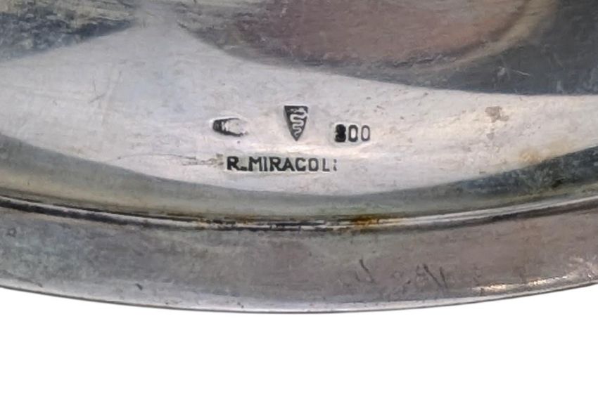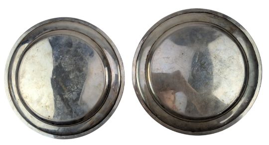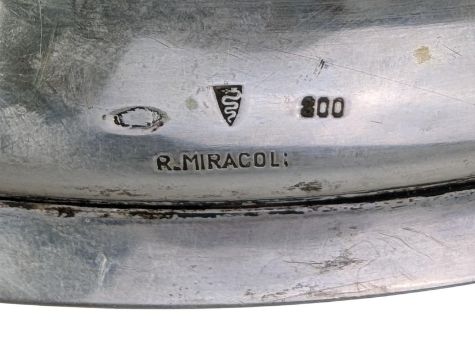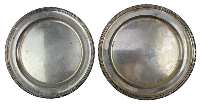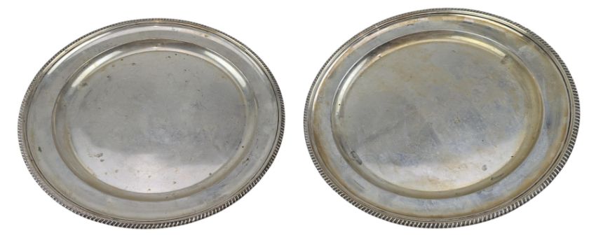 A pair of 1940s Italian 800 silver platters by R. Miracoli, Italian Silversmiths. Each having a gadrooned rim, stamped 800 silver mark and the Bisciaone (Visconti serpent) logo of Milano. Total weight approx 935g.