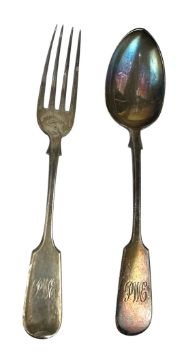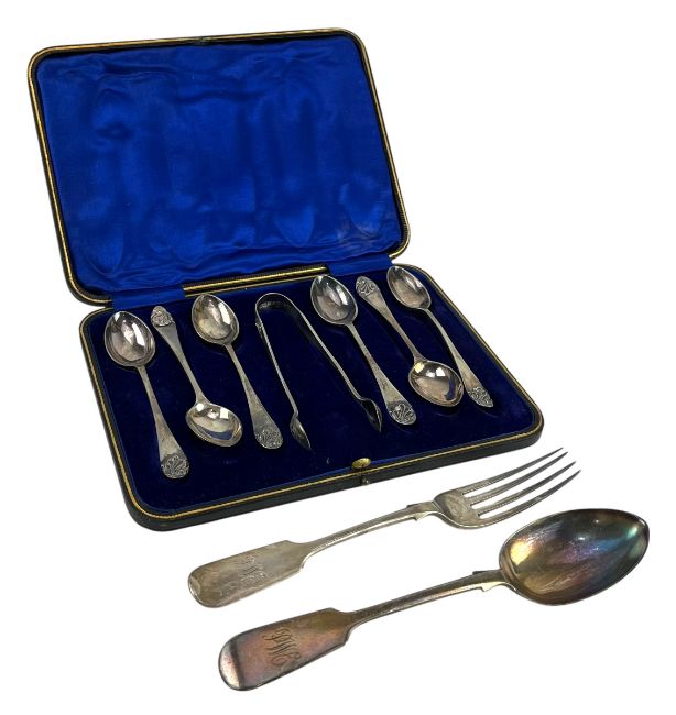 A cased Edward VII hallmarked silver spoon and sugar tong set. The lot to include a boxed set of six teaspoons and a pair of sugar tongs. Hallmarked year 1906, Sheffield. Sponsors mark for Thomas Turner & Co. Complete in a presentation box. Together with a Victorian hallmarked silver fork & spoon. Hallmarked year 1877, Exeter. Sponsors mark rubbed. Total weight approx 204g