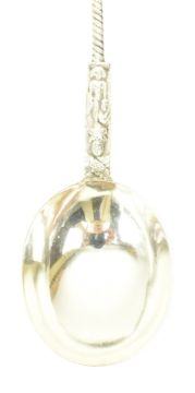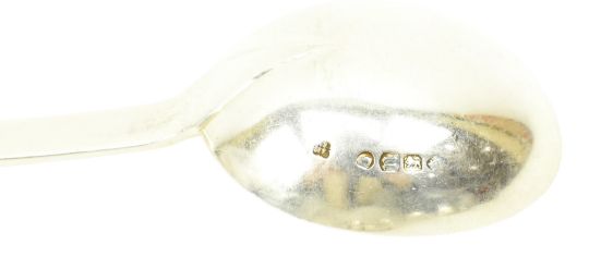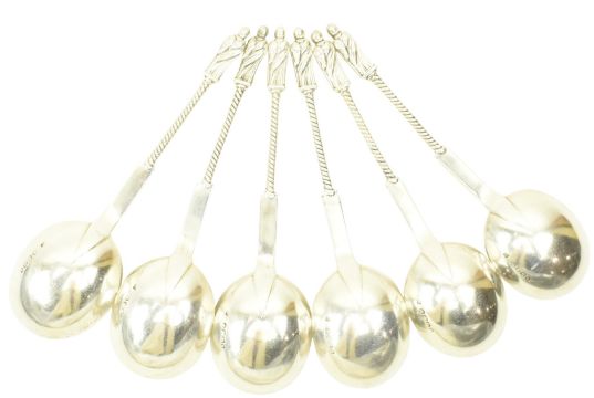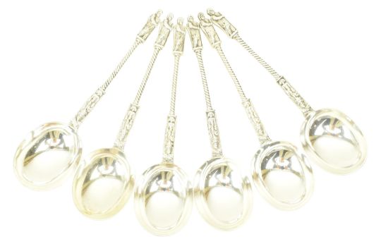 A set of six Victorian 19th century hallmarked silver Apostle soup spoons. Hallmarked year 1875, London. Sponsors mark illegible. Total weight approx. 295g.