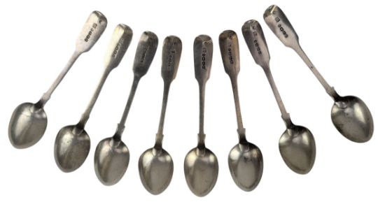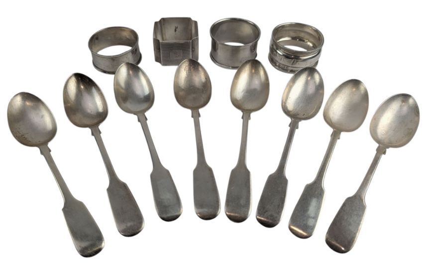 A set of 8 Victorian hallmarked silver spoons. Hallmarked year 1854, Exeter. Sponsors mark for Josiah Williams & Co (James & Josiah Williams). Together with 4 hallmarked silver napkin rings. Birmingham Assay Office with various date & sponsors marks. Total weight approx. 218g.