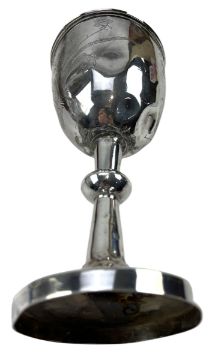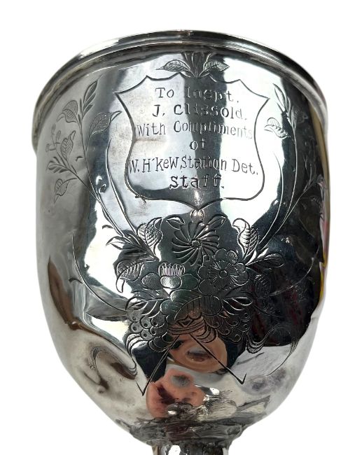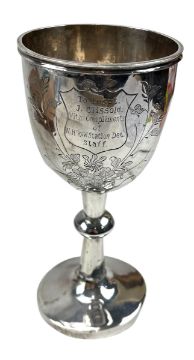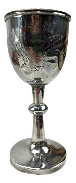 A 20th century silver stemmed wine drinking goblet. Engraved 'To Inspt. J. Clissold with compliments of W H Kew Station Det Staff' admist floral design. Unmarked. Tested indicates silver. Weight approx. 189g.