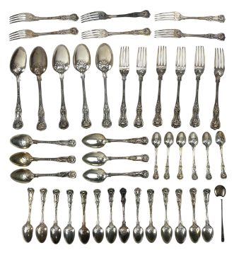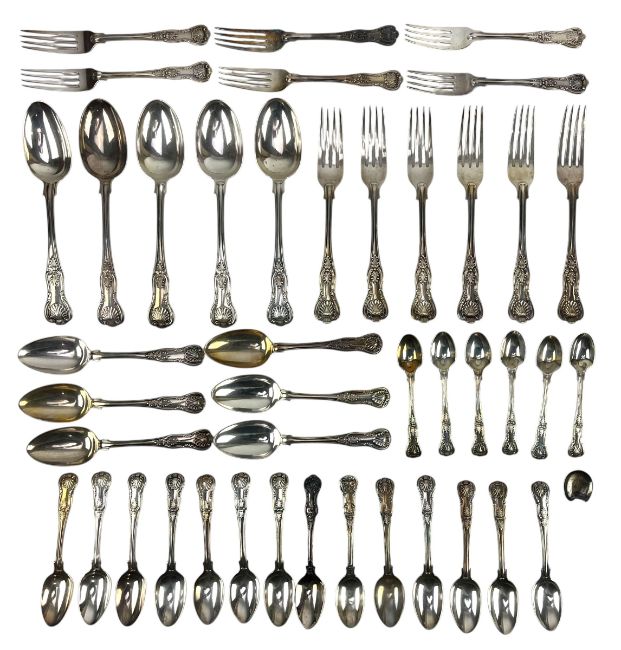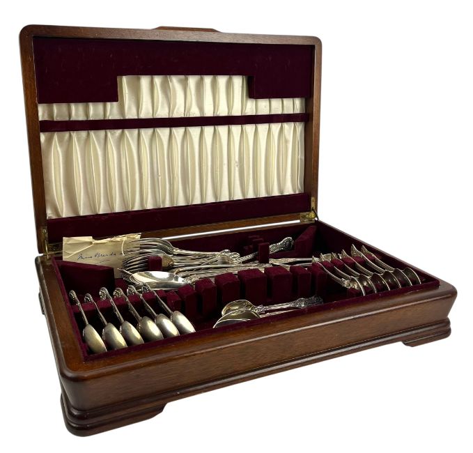 A cased Edward VII hallmarked silver canteen of cutlery. The lot comprising six table forks, five table spoons, six dessert spoons, six dessert forks, fourteen teaspoons and six egg spoons. Hallmarked year 1908, London. Sponsors mark for Josiah Williams & Co (George Maudsley Jackson & David Landsborough Fullerton). Completed in a wooden case. Weight approx 2540g.