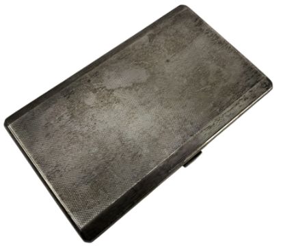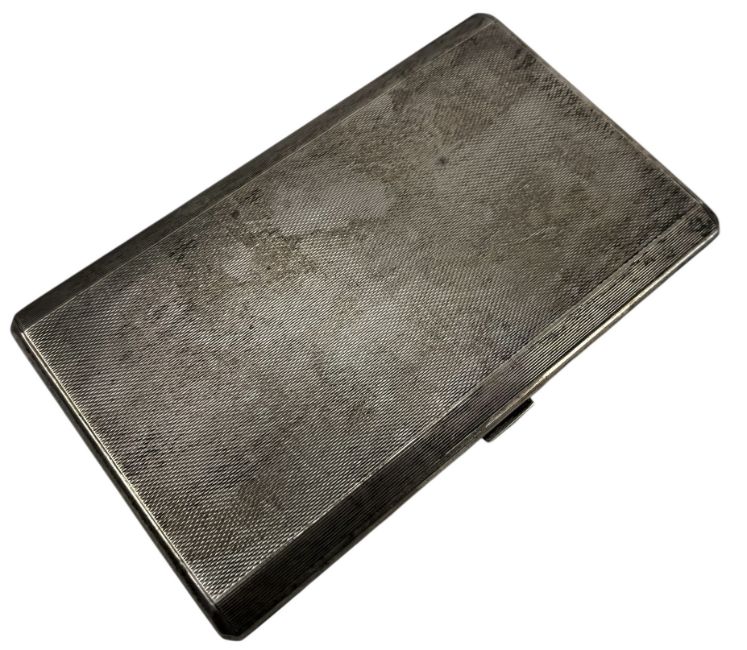 A George VI hallmarked silver cigarette case. The case of rectangular form with engine turned decoration and an initial. Hallmarked year 1950, Birmingham. Sponsors mark for Cohen & Charles. Weight approx. 180g.