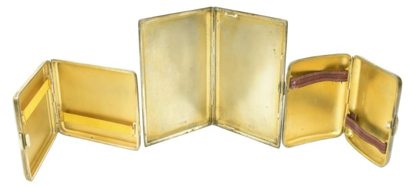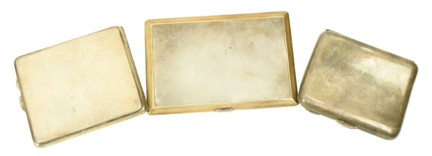 A collection of three silver hallmarked cigarette cases. The lot comprising an Edward VII hallmarked silver cigarette case. Hallmaked year 1906, Chester. Sponsors mark for Stokes & Ireland Ltd (William Henry Stokes & Arthur George Ireland). Together with a George V hallmarked silver engine turned cigarette case. Hallmarked year 1934, Birmingham. Sponsors mark for Joseph Gloster Ltd. Further together with a George V hallmarked silver engine turned cigarette case. Hallmarked year 1937, London. Sponsors mark rubbed. Total weight approx. 470g.