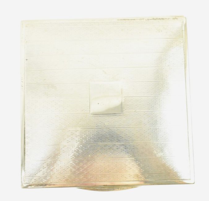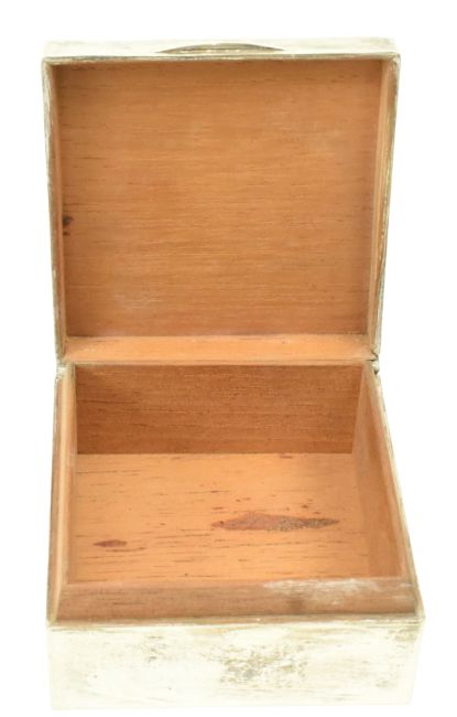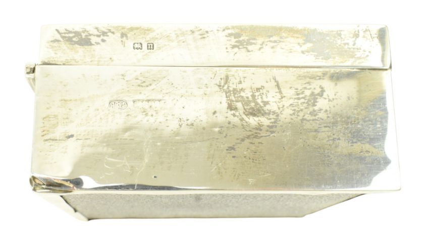 A 20th century hallmarked silver desk top cigarette case with wooden lining. Date & sponsors marks rubbed. Gross weight 189g.
