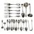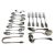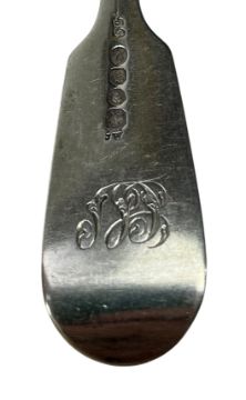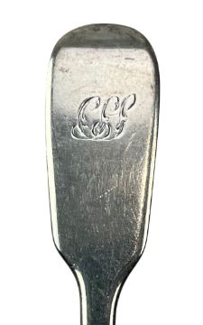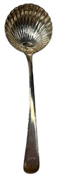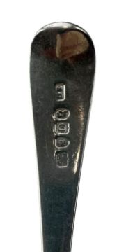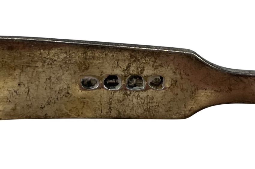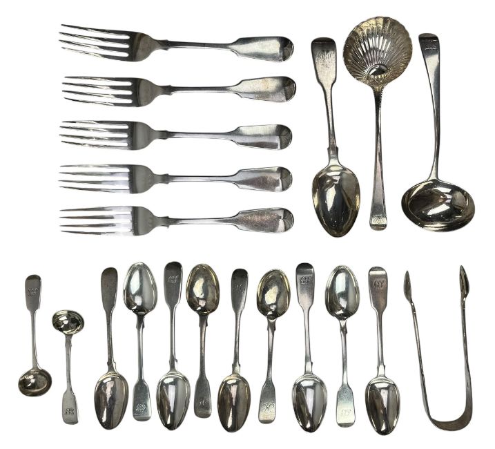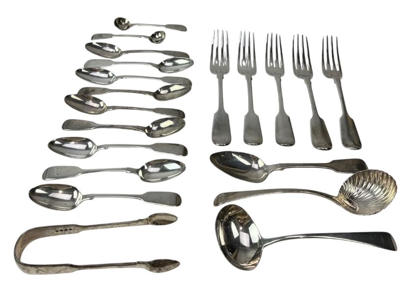 A set of five William IV hallmarked silver dining/table forks. Hallmarked year 1836, London. Sponsors mark for Benoni Stephens. Togeher with set of eight William IV hallmarked silver teaspoons. Hallmarked year 1836, London. Sponsors mark for William Eaton. Also comes with a William IV hallmarked silver dessert spoon. Hallmarked year 1834, London. Sponsors mark for Jonathan Hayne, a George III hallmarked silver sauce ladle. Hallmarked year 1799, London. Sponsors mark for Richard Crossley, and a pair of George IV hallmarked silver sugar tongs. Hallmarked year 1824, London. Sponsors mark for Richard Poulden. Included are also two hallmarked silver sauce ladles. Total weight approx. 818g.