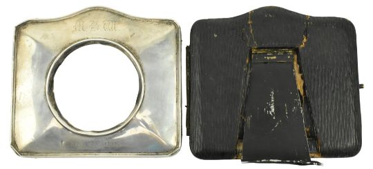 A 19th century 8-day travel clock in a hallmarked silver pocket watch clock case (AF). The hallmarked silver & leather-bound easel back case engraved with monogramme & dated April 23rd 1914. Hallmarked year 1913, Birmingham. Sponsors mark for Henry Matthews. The goliath pocket watch clock being decorated with white enamel dial with bold black Arab numerals and seconds subsidiary dial. Plain unmarked white metal case. Total weight approx. 324g.