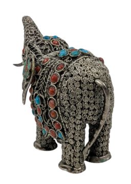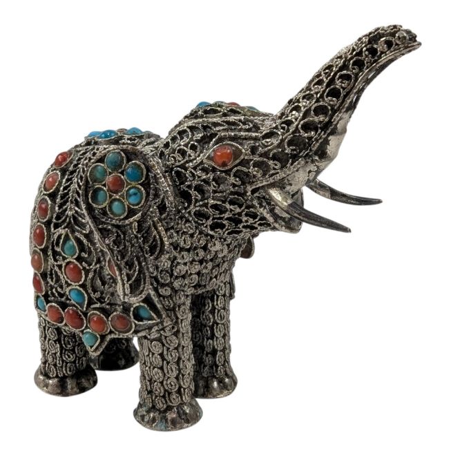 An Indian silver figure of an elephant. The elephant being decorated with turquoise and red cabochon stones. Stamped 925. Weight approx 35g.
