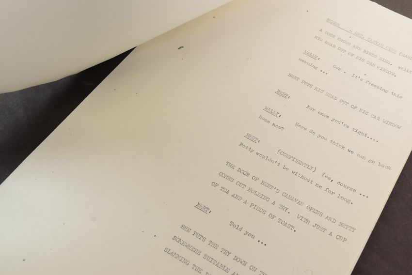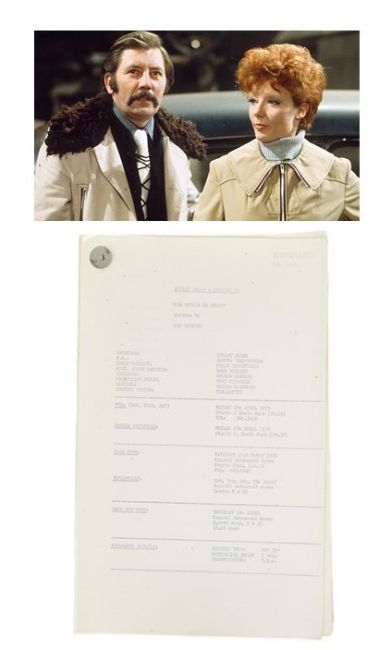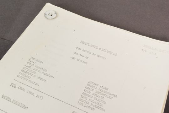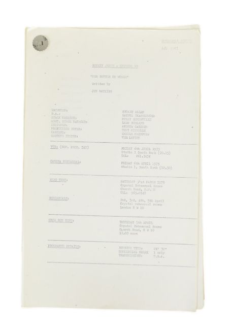 The Ronald Wolfe Collection – Romany Jones (LWT Sitcom 1972-1975) - original Rehearsal Script for Series 2 Episode 4 'For Better Or Worse' by Jon Watkins (sometimes credited as John Watkins). 52pp on white stock, plus cover and cast list page. Dated March 1973, 'Romany Jones - Episode 10'. Original fastener to corner, unmarked within. (1)