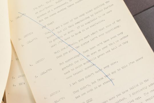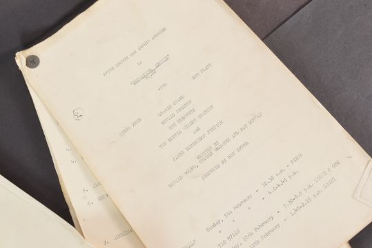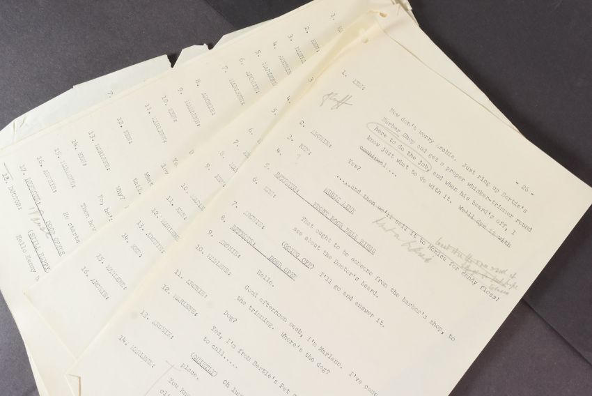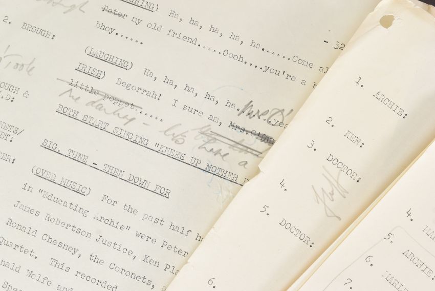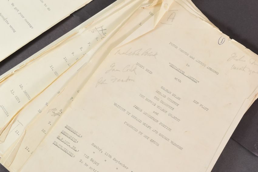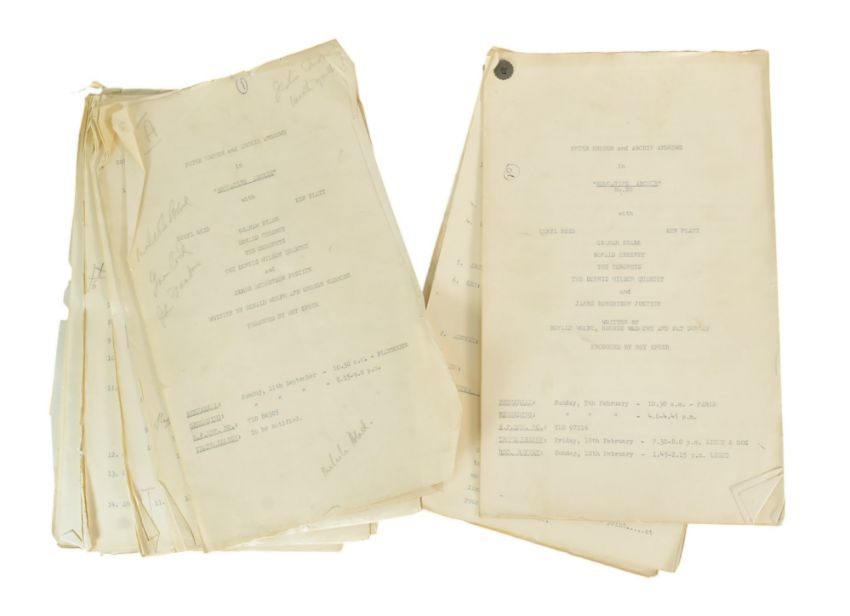 The Ronald Wolfe Collection – Educating Archie (BBC Radio Programme 1950-1960) - two original production scripts. 'No.1' starring Beryl Reid, Ken Platt, Graham Stark, Ronald Chesney and James Robertson Justice. 32pp. Plus 'No.20' starring the same cast. 31pp. Both annotated throughout by Wolfe, and signed to the cover noting the scripts as his. Early pieces of British comedy memorabilia.