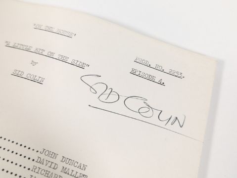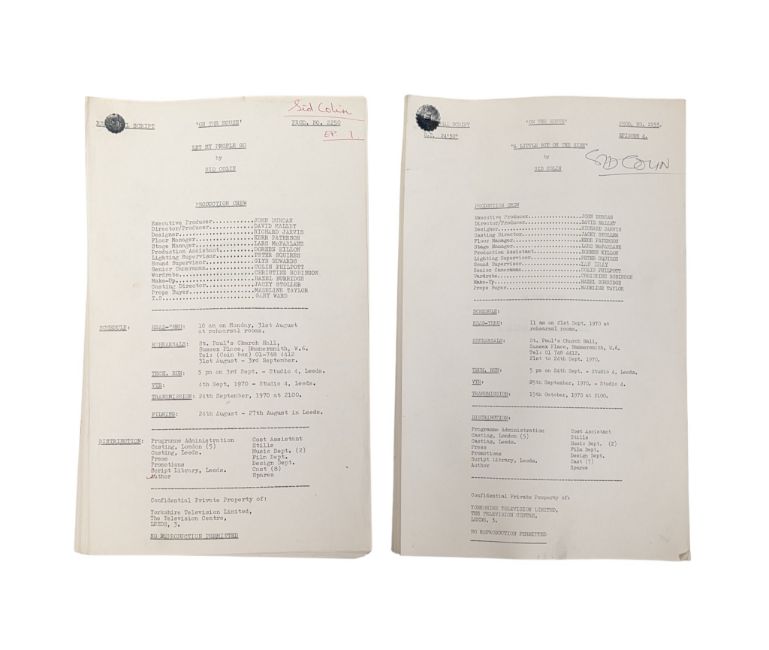 The Sid Colin Collection - On The House (1970-71 Yorkshire TV sitcom by Sid Colin starring Kenneth Connor) - two of Colin's original production used rehearsal scripts for two episodes; Episode 1 'Let My People Go', and Episode 4 'A Little Bit On The Side'. Both named to the cover. Brief amendments / annotations throughout in Colin's hand. (2)
