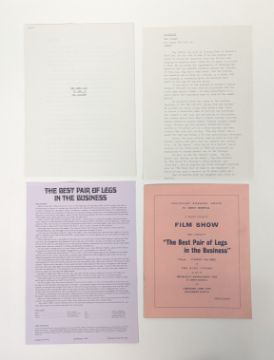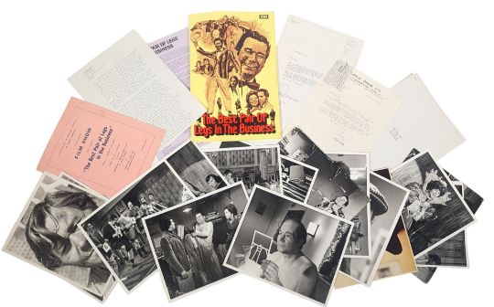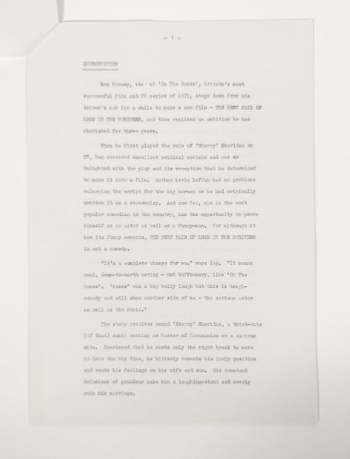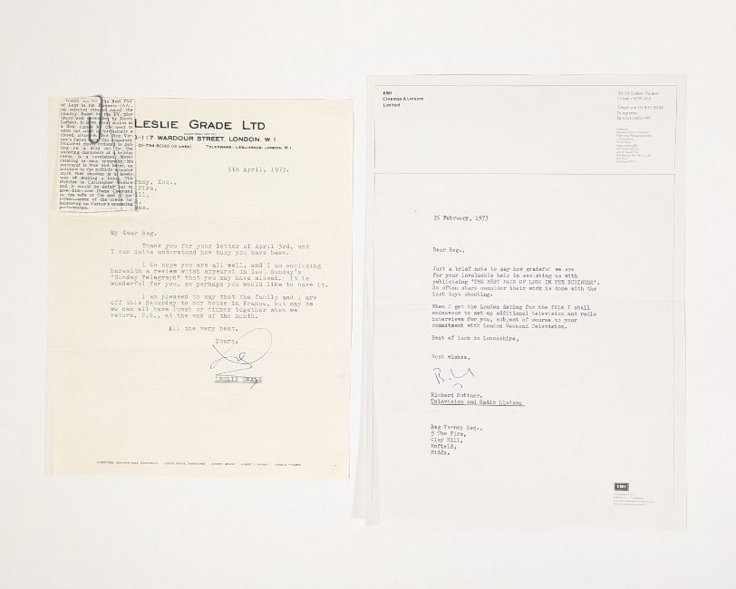 Reg Varney - The Best Pair Of Legs In The Business (1973 British comedy-drama film) - Varney's personally owned complete press pack for the feature film in which he starred, along with two letters relating to the production. The first letter to Varney from Leslie Grade sending him a copy of a good review, and the second from Richard Kuttner thanking Varney for his assistance in promoting the movie. Both on Leslie Grade / EMI headed stationery. The press pack contains a typed synopsis, detailed cast biographies, x14 photographs including one colour, a page of biography for Varney and the original presentation folder. Further supplied is a programme from a 'Grand Charity Show' screening of the film, 10th April 1973, likely the film's premiere event.
