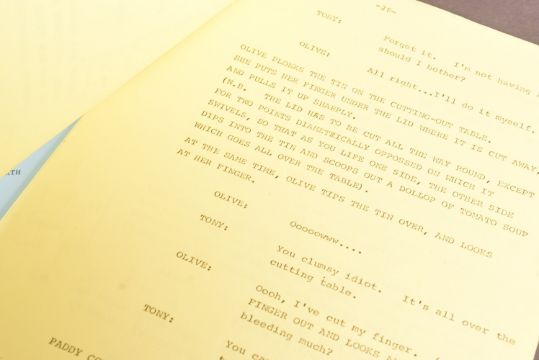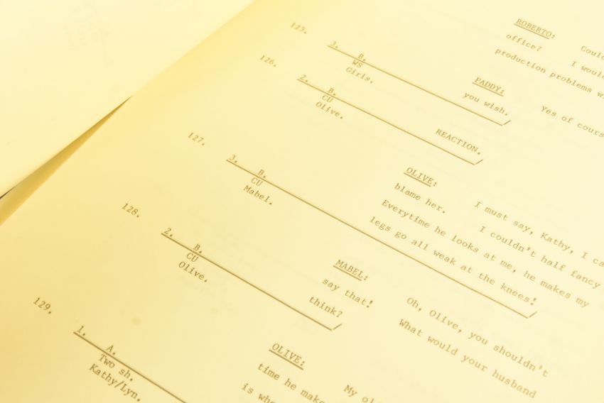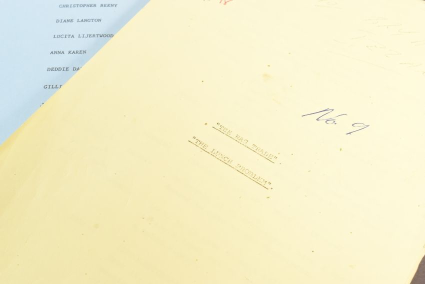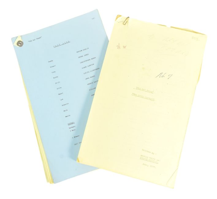 The Ronald Wolfe Collection - The Rag Trade (ITV Sitcom 1977-1978) - two original production used camera scripts for the ITV colour series; S1 Episode 4 'The Lunch Problem' and S1 Episode 6 'The Italian Line'. Yellow and blue pages. 'The Italian Line' appears to be lacking the cover page, and back page. (2)