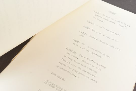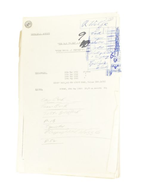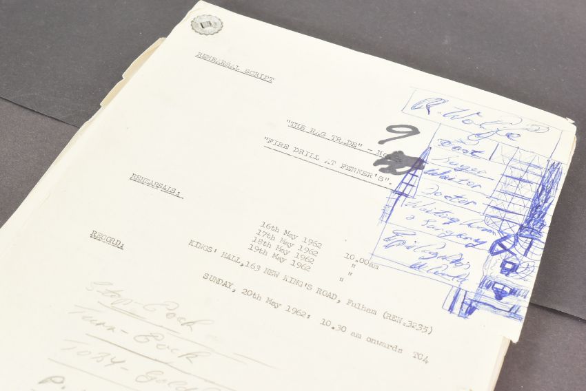 The Ronald Wolfe Collection - The Rag Trade (BBC Sitcom 1961-1963) - an original production used rehearsal script for Series 2 Episode 9 'Safety Precaution' (originally titled 'Fire Drill At Fenner's'). 56pp on off-white stock, with original fastener to corner. Dated May 1962. Signed to the cover by Wolfe, noting the script as his. Some notes to the cover, and a few amendments within, in Wolfe's hand.