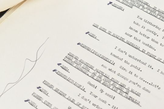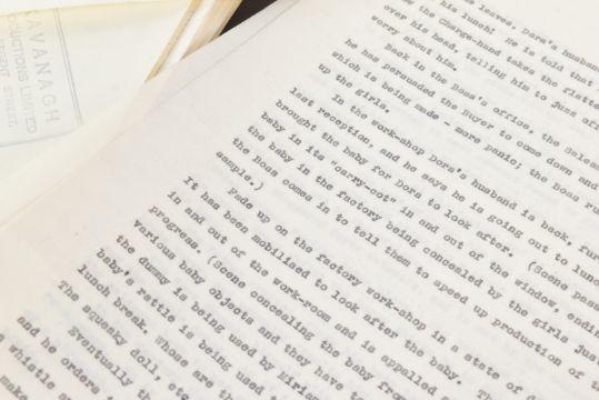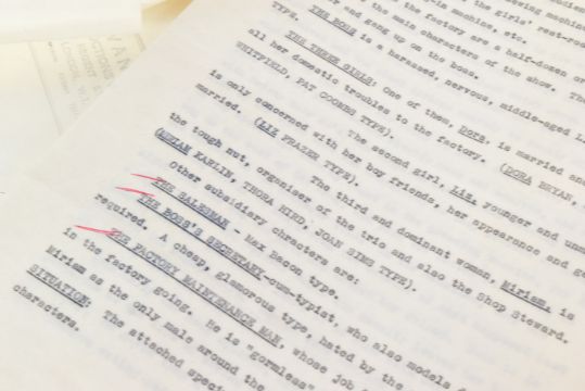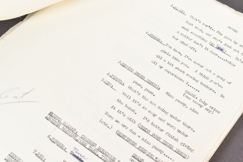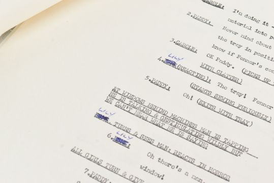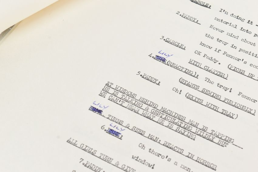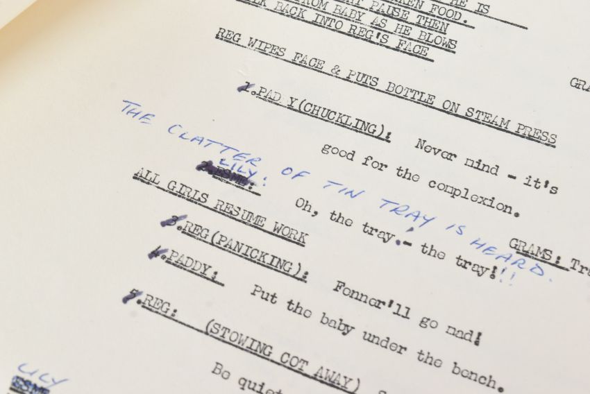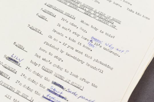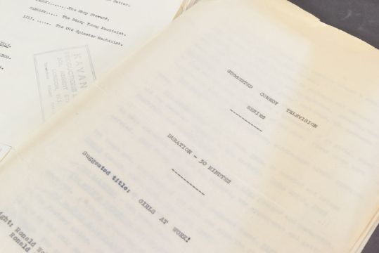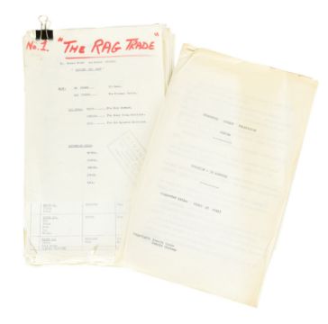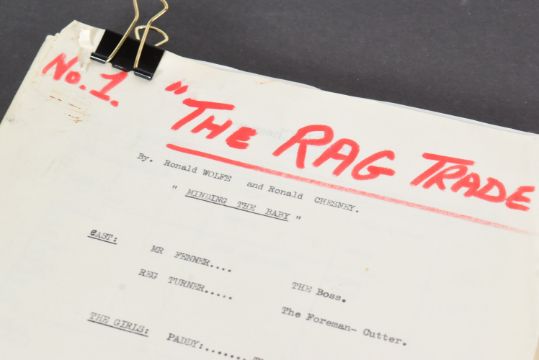 The Ronald Wolfe Collection - The Rag Trade (BBC Sitcom 1961-1963) - Wolfe and Chesney's original production used working rehearsal script for the pilot episode 'The Baby' (originally titled 'Minding The Baby'). 49pp plus cover and running order pages on off-white stock, with original fastener to corner. Heavily annotated throughout by Wolfe and Chesney, both making many notes / changes within. Complete script. Later partial cover page, typed on Ronald Chesney headed paper. Titled by hand 'No.1 The Rag Trade'. Along with an original master typed series premise outline carrying the working title 'Girls At Work!' 5pp on typing paper, with some markings made within. This document features an episode synopsis, demonstrating the general idea for the show, and was a vital document in the creation of the show. A vintage 8x10" black and white press photograph of Varney as 'Reg' is also included, with LWT stamped to rear. Important pieces of British sitcom history. (3)