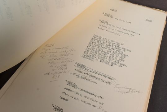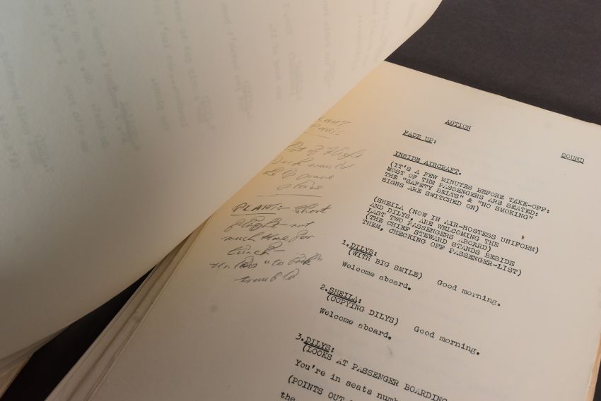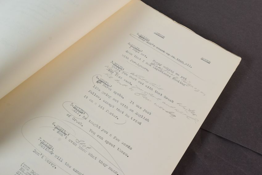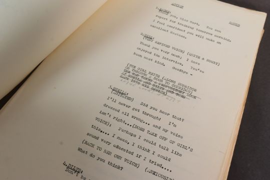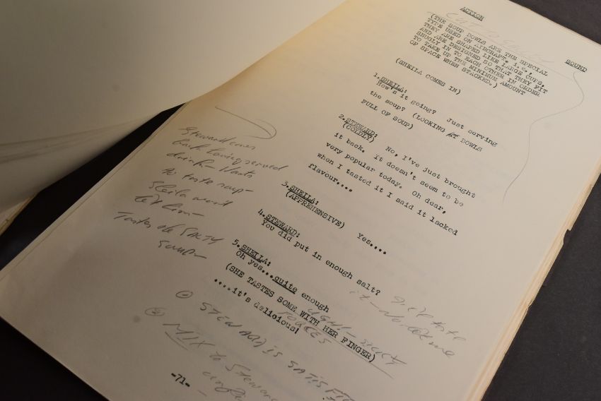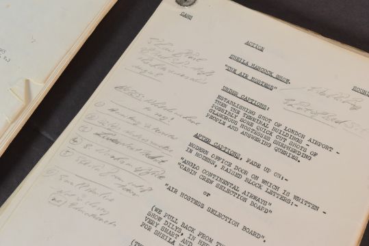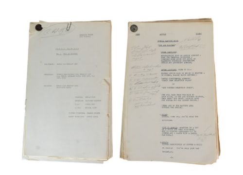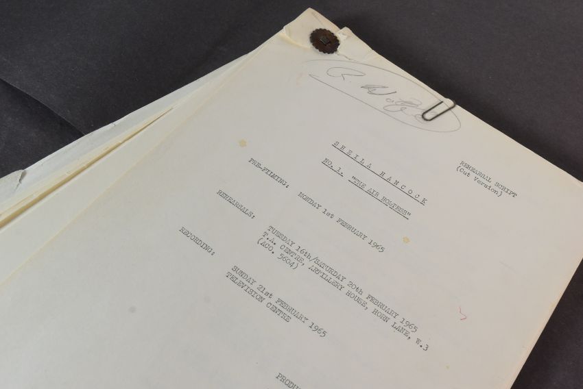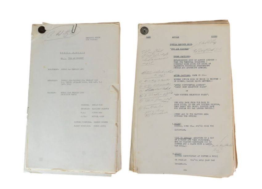 The Ronald Wolfe Collection - The Bed-Sit Girl (BBC Sitcom 1965-1966 starring Sheila Hancock) - two original production used rehearsal scripts for the first recorded episode, Series 1 Episode 1 'The Air Hostess'. The first being 64pp plus cover, and Wolfe's working script (89pp) comes heavily annotated with notes made during the rehearsal prior to recording. Before going to air, the first series was officially known as 'The Sheila Hancock Show'. The first script signed by Wolfe to the cover, noting the script as his. Some amendments / changes within in his hand. Sources indicate that whilst this was the first episode recorded, it may have been broadcast in a different order. Important pieces of comedy history. (2)