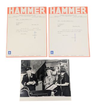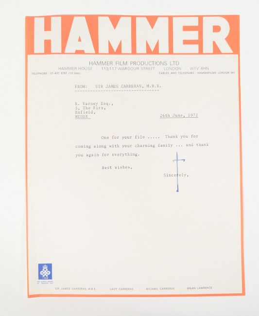 Reg Varney - Mutiny On The Buses (1972 feature film-spin off and sequel to On The Buses) - two letters on headed Hammer Film Productions Ltd stationery from Sir James Carreras to Varney. The first enclosing a photograph 'for your file' and thanking Varney for attending an event. The second letter dated the same refers to an unknown gift being enclosed to Varney's daughter. Along with the original on-set black and white 8x10" photograph of Varney taken during production. Both letters dated 26th June 1972, likely referring to the wrap party. (3)