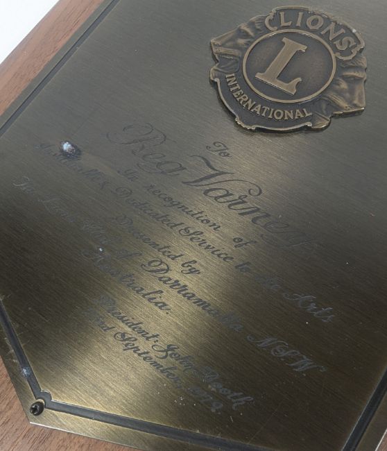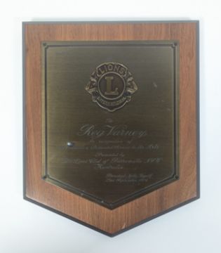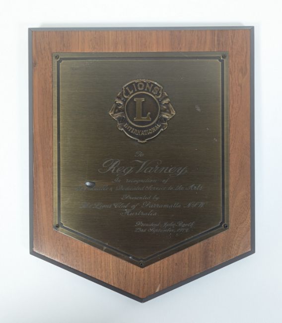 Reg Varney - original award plaque 'To Reg Varney, in recognition of Invaluable & Dedicated Service to the Arts, presented by The Lions Club of Parramatta NSW, Australia. President John Booth, 23rd September 1979'. Brass, mounted on wood. Small area of corrosion on the word 'Invaluable'. 28cm tall. Along with an A4 printed photograph of Varney as Stan in On The Buses, also from his own collection. (2)