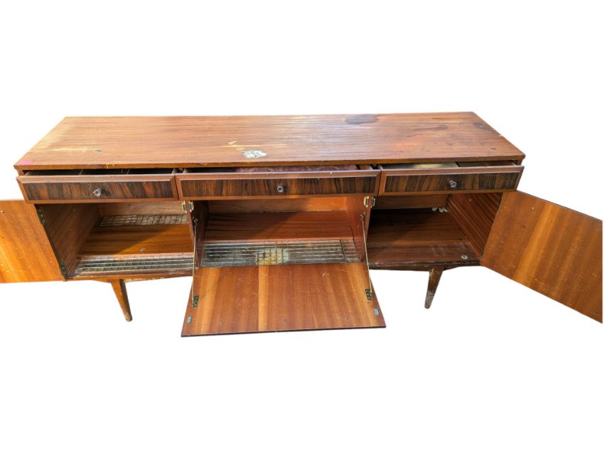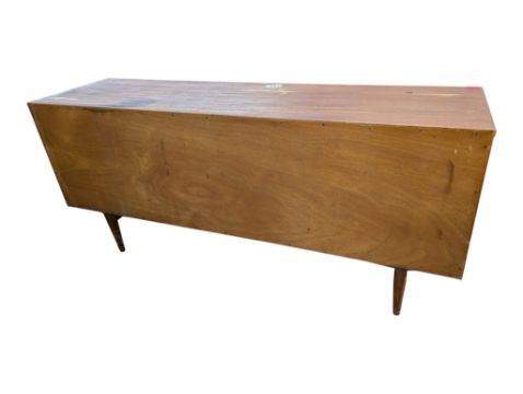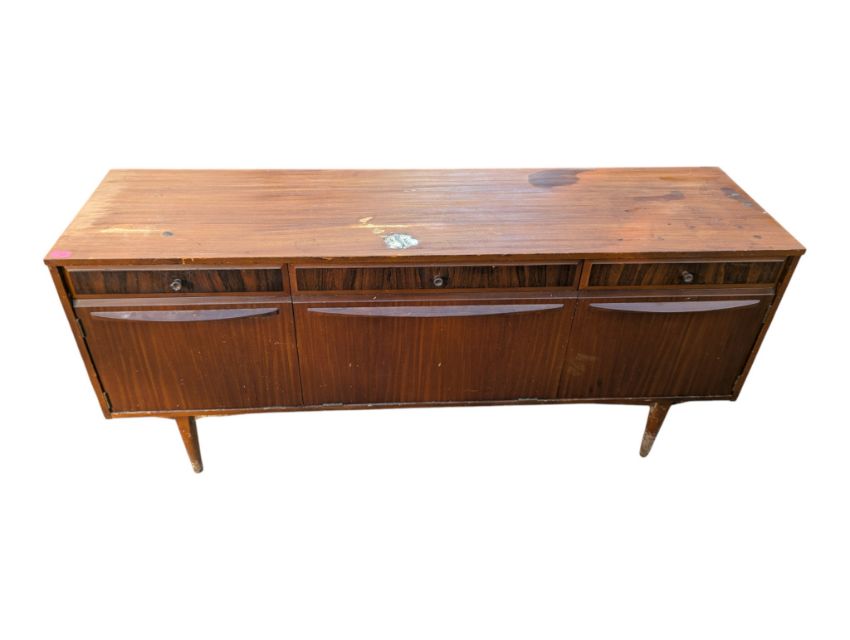 Elliots of Newbury EON - A mid century teak wood sideboard credenza. The sideboard comprising a series of short drawers with cupboards beneath. All raised on tapering legs. Knob handles to the drawers. Measures approx: 76x166x45cm