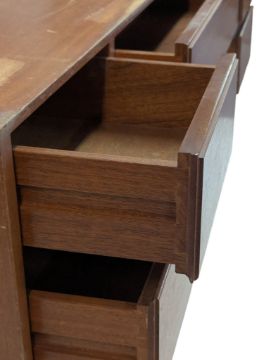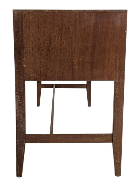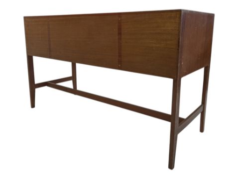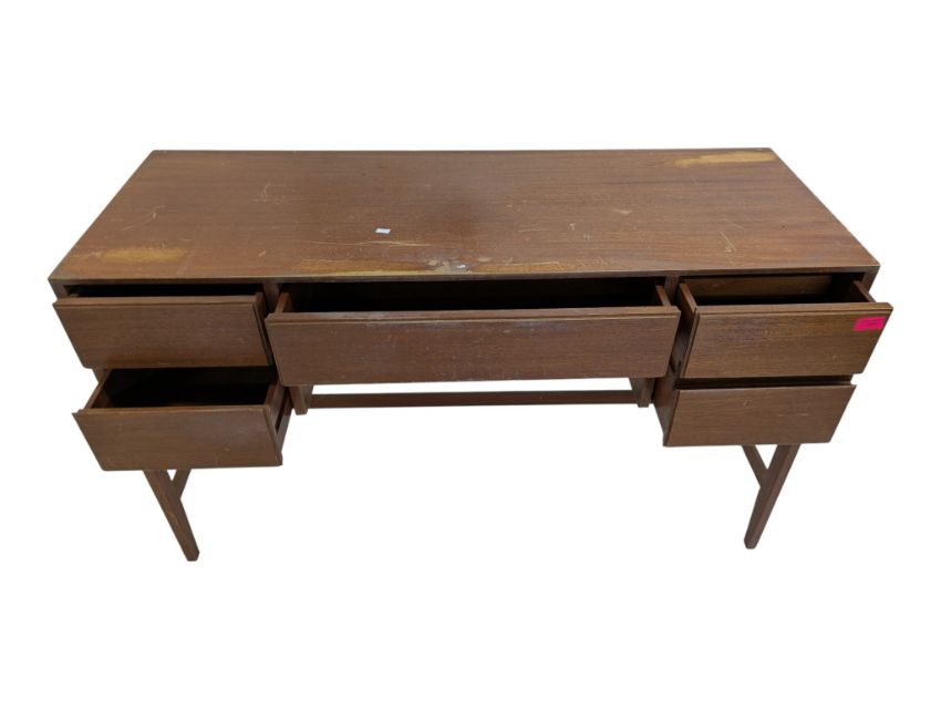 Heals of London - Loughborough Furniture - A vintage 20th century teak wood dressing table. Of rectangular form with one central drawer flanked by a bank by two smaller drawers. Standing on square tapering legs united by single rear stretcher. AF and maker's mark to interior. Measures approx: 72x122x46cm