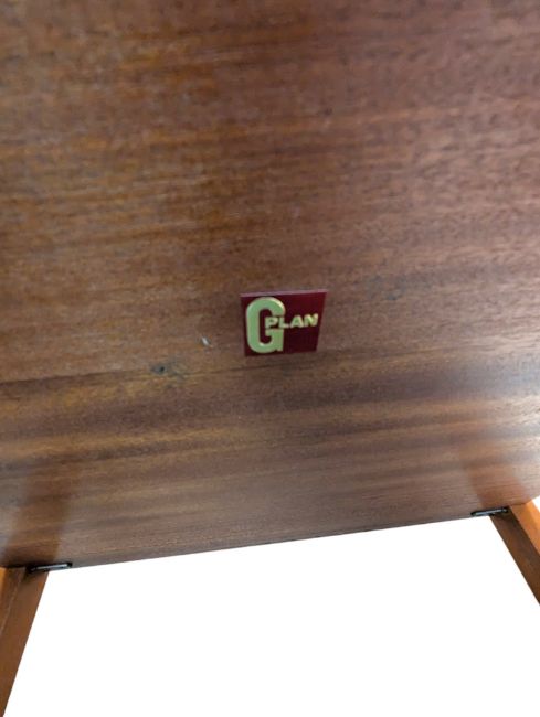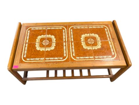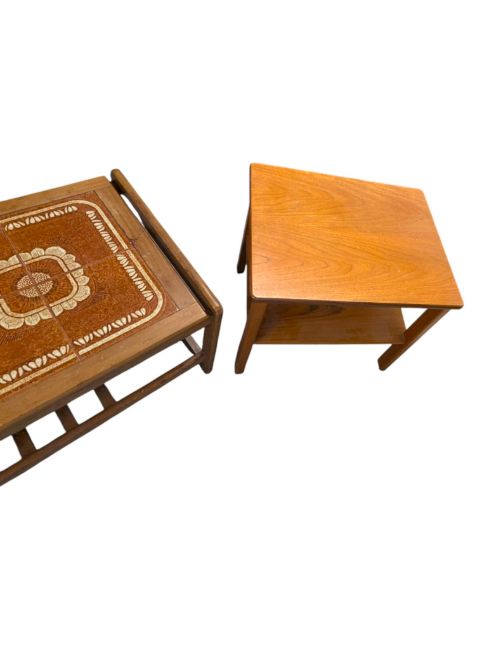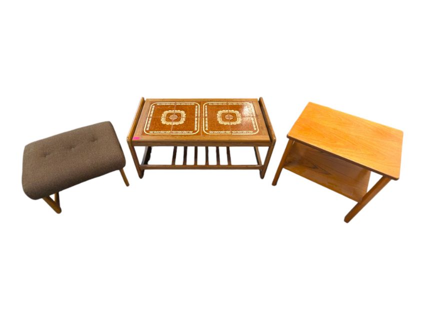 Collection of mid century teak living room furniture. Comprising a tile top two tier coffee table with a rectangular top and magazine rack lower tier, a G-Plan two tier coffee table and a low rectangular shaped upholstered stool. Measures approx: 44x96x51cm