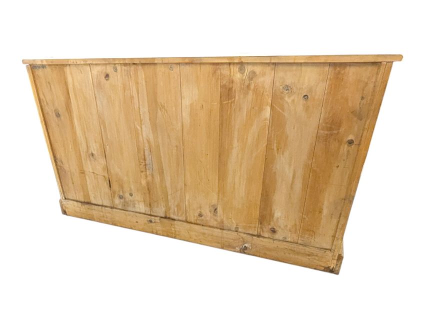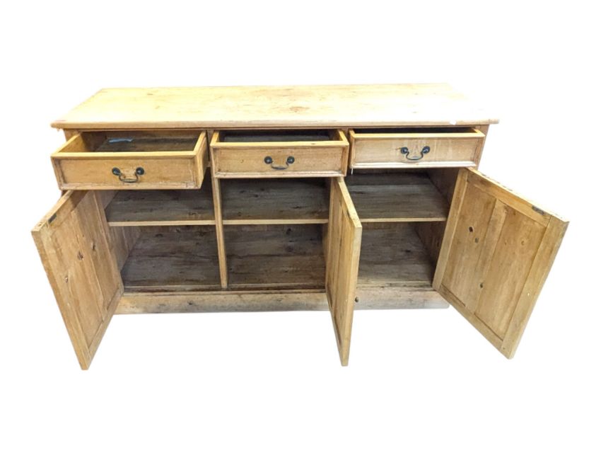 A 20th century country pine kitchen sideboard / dresser. Features three drawers over three panelled cupboards. All being raised on a plinth base. Measures approx: 92x162x55cm