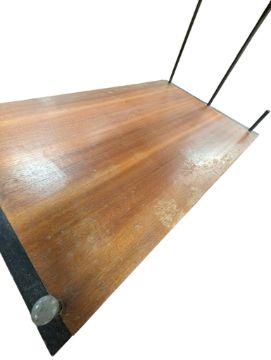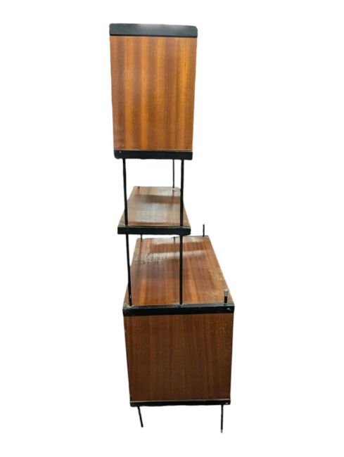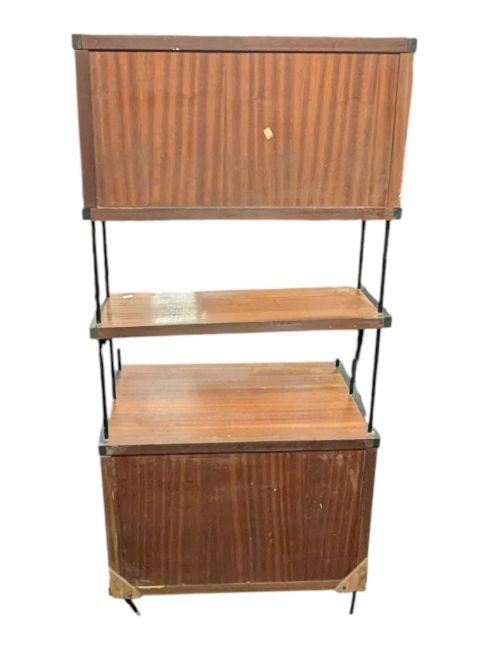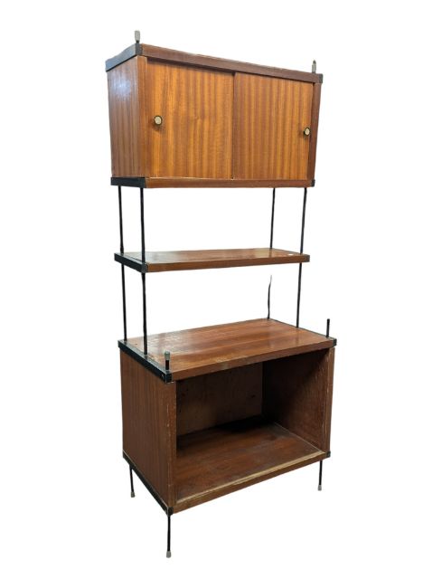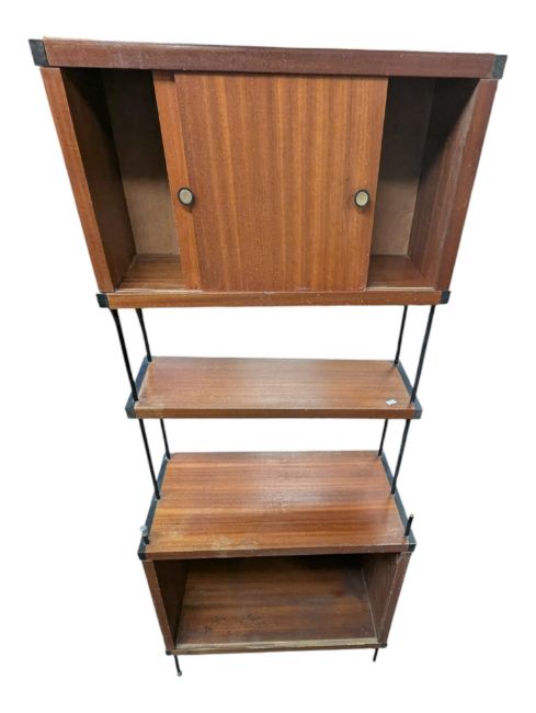 Avalon Manner - A vintage 20th century teak modular wall unit - bookcase cabinet. Having a twin sliding door cabinet to top with floating shelf and another cabinet to lower. Complete with metal ebonised supports. Measures approx: 144x64x39cm