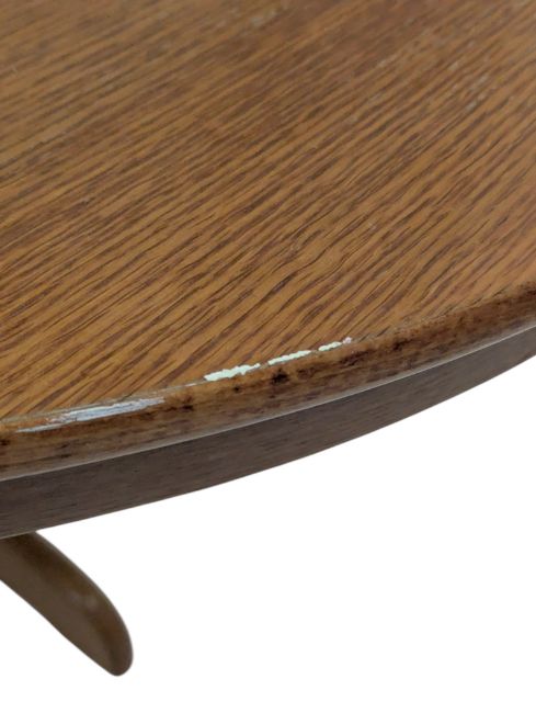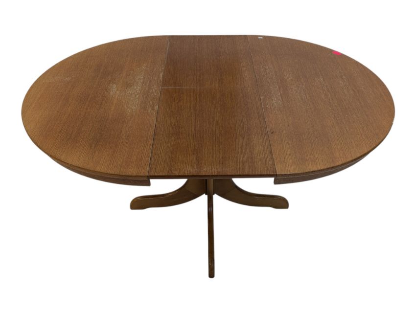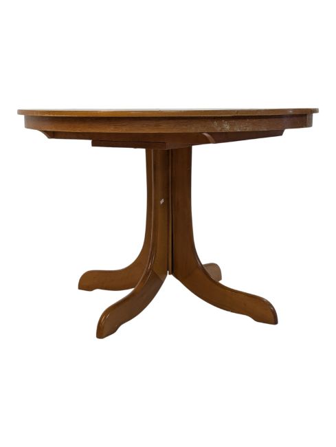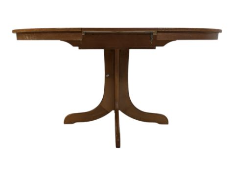 Mid Century Modern Design - A mid 20th century teak circular extending dining table. The table having circular top over a pedestal base with splayed supports. Measures approx: 74x107cm