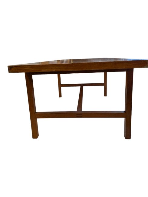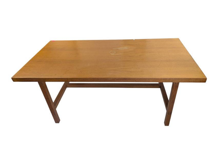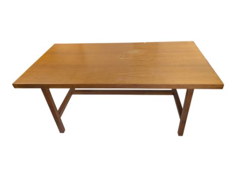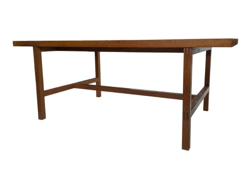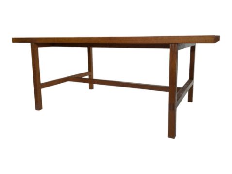 A large vintage 20th century teak workshop factory industrial table. Large rectangular form with upright supports all united by single large stretcher. Measures approx: 71x184x92cm