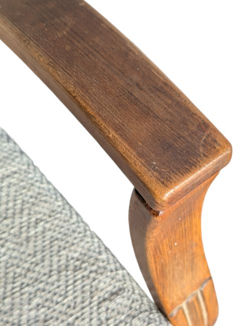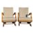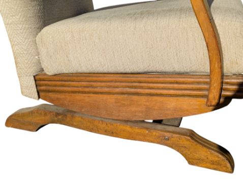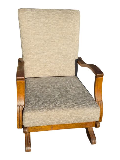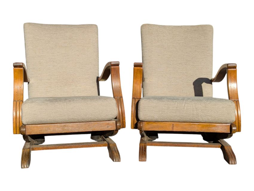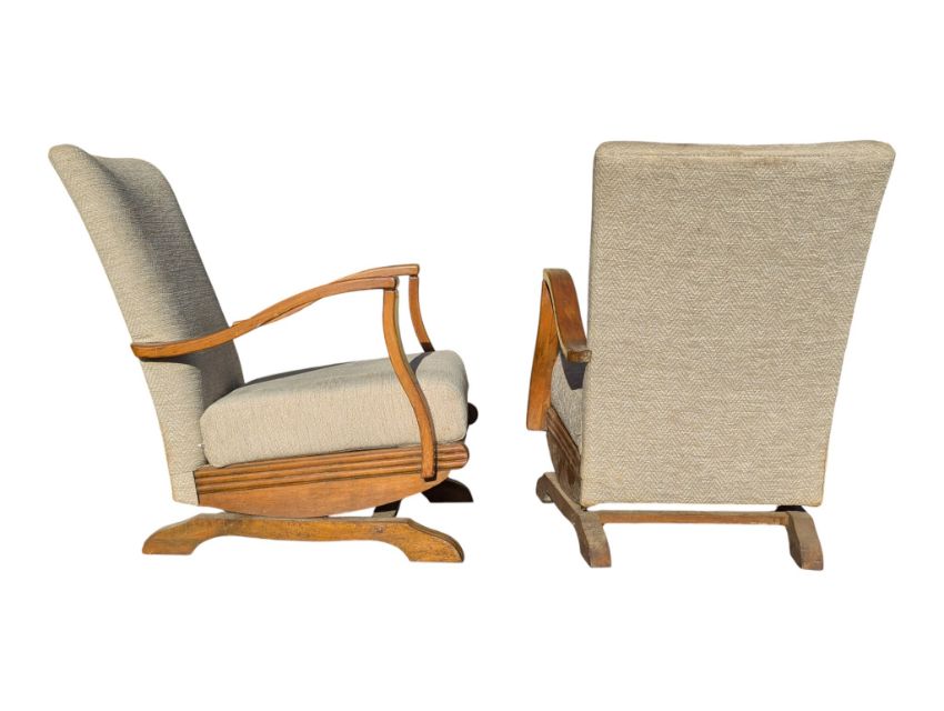 A pair of post war 1950s Art Deco bendwood Halibala style rocking chairs. The armchairs raised on sprung bases with contemporary upholstered seat frames being flanked by show wood bentwood elbow rests. Measures approx: 85x61x70cm