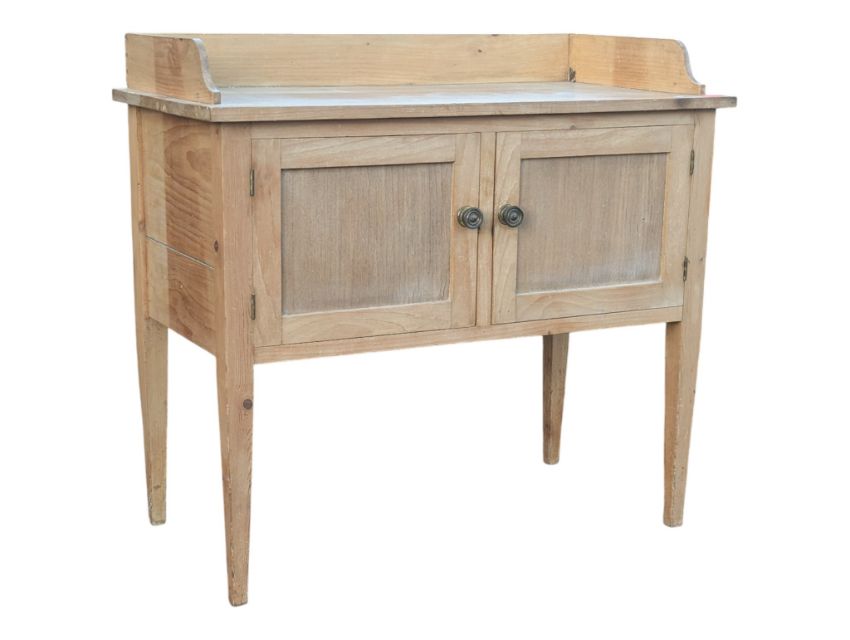 An Edwardian circa 1900s pine washstand cabinet. The washstand having a stage gallery back top over a twin door cabinet. All raised over tapering supports. Measures approx: 85x91x46cm