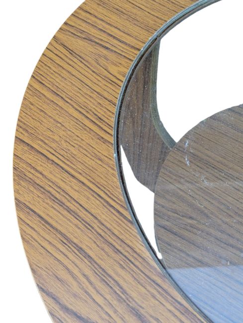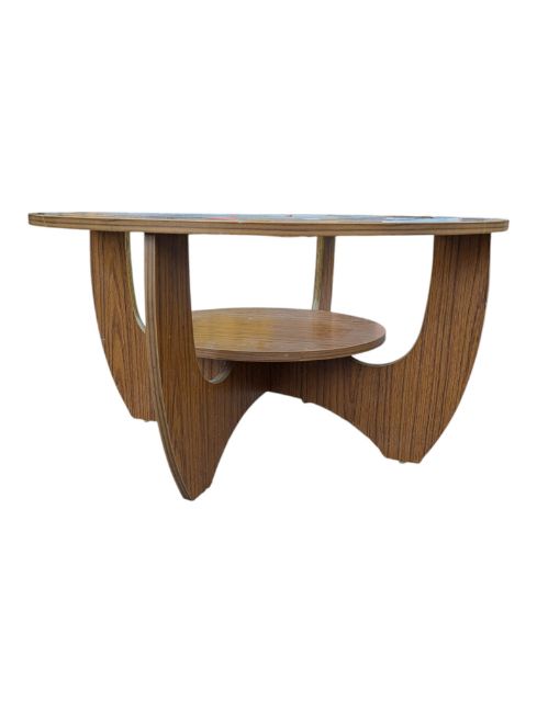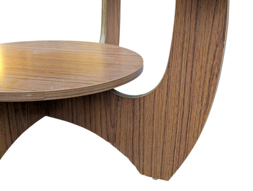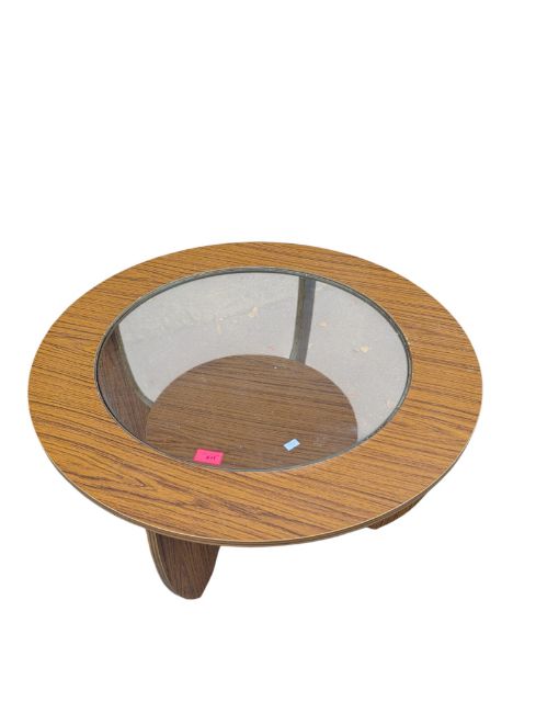 British Modern Design - A vintage 20th cenutry teak veneer coffee table. In the manner of G-Plan Furniture Astro design. The table of circular form with drop in glass insert and raised on shaped legs united by under tier. Measures approx: 41x76cm