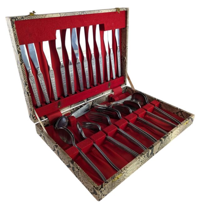 A vintage stainless steel and silver plate canteen of cutlery. The cutlery to have floral motivs, the set also to include some silverplated examples. All house within a snakeskin effect