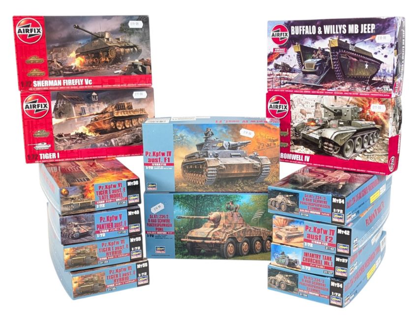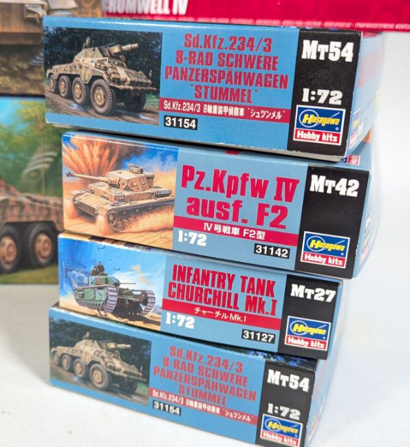 Model Kits - a collection of retro assorted boxed and un-used 1:72 scale plastic Hasegawa and Airfix British and German army vehicle model kits , to include; Infantry Tank Churchill Mk.I No. 31127, Pz. Kpfw IV ausf. F2 No. 31142, Sd. Kfx 234/3 8-rad schwere panzerspahwagen 'stummel' No. 31154, Buffalo & Willys MB Jeep No. A02302V, Cromwell IV No. AO2338, and others. Includes approx. 14 model kits.