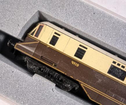 Model Railway - a boxed Graham Farish / Bachman N gauge model railway train set locomotive No. 371-626 a streamlined railcar in GWR lined chocolate and cream with shirtbutton emblem.