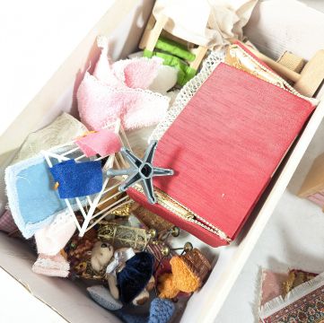Dolls - a large collection of assorted wooden and china wooden dolls house furniture, to include: soft furnishings, tables, chairs, white goods, sinks, baths, sofas, mirrors, and much more.