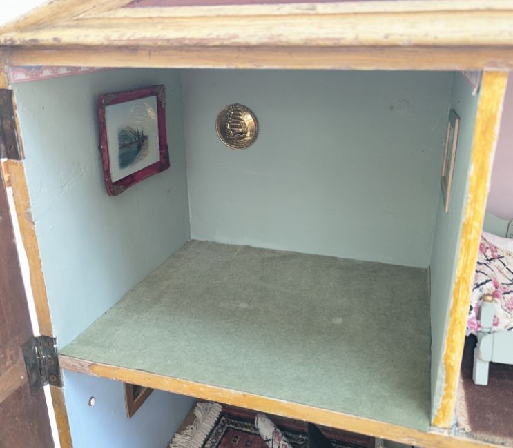 Dolls House - a vintage early 20th century scratch built wooden dolls house, together with a small selection of dolls house furniture; to include wall hangings, chandelier, tables & chairs, double bed and other. Front opening with 2 floors and 4 rooms, 2 being carpeted. Measures approx 66x66cm.