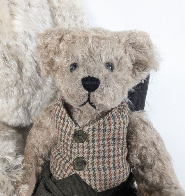 Bears - 2x vintage mohair jointed bears, to include: Ganz Cottage Collectibles 'Bobby' bear No. CC653 wearing trousers and waistcoat with blonde mohair measuring approx. 28cm, together with a Pam Howell 'Bears That are Special' bear with white mohair, measuring approx. 60cm.
