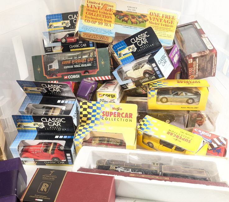 Diecast - a large collection of assorted vintage diecast model cars of various scales and makers, to include; a boxed Astra Anti-Aircraft Gun, Dinky Toys Striker Anti-Tank vehicle No. 691, Dinky Toys Army covered wagon No. 623, Classic Car Collection models, Maisto supercar collection, Corgi Queen Elizabeth II Golden Jubilee gold plated Routemaster bus No. CC25903, Bump & Go, a Pacific Chapelon Nord locomotive train model, and a collection of loose vintage vehicles including Dinky, Corgi. Lesney, Matchbox, 007 and other.