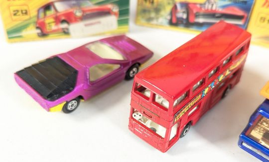 Diecast - a collection of x12 original vintage Lesney made Matchbox Superfast boxed diecast model cars to include; No. 73 Alfa Carabo, No. 61 Blue Shark, No. 68 Porsche 910, No. 13 Baja Buggy and others. Models generally appearing VG+/EX.