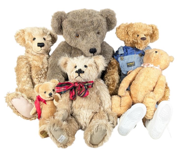Teddy Bears - a collection of assorted 1940-80s retro soft teddy bears, to include; Asquith, Bear with me, Iris Voorhies, Merythought, Osh Kosh Goose Creek Gloria Franks bear, Barton bears. The bears having a mixture of blonde and grey fur, one wearing a pair of Osh Kosh dungarees. Largest measures approx. 77cm.