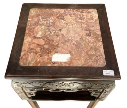 A 19th century Chinese rosewood and marble top twin tier pedestal side table. The table with pink marble top inset, carved foliate fretwork friezes and carved uprights terminating in ball and claw feet.