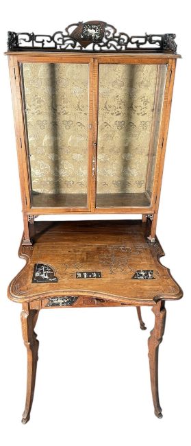 An Aesthetic Movement late 19th/early 20th century inlaid and lacquered fruitwood glazed cabinet on stand. The Chinese cabinet having a pierced gallery back over glazed doors revealing a shevled interior with silk lined back. The cabinet top raised on a shaped top base decorated with lacquered and mother of pearl inlays depicting a landscape and figures. Single matching drawers below, all raised on splayed shaped legs.