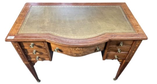 An Edwardian early 20th century mahogany inlaid bow front writing desk. The writing table having a central gilt tooled leather skiver. Bow fronted central kneehole drawer with satinwood inlaid swags motifs, all flanked by banks of three drawers. All taised on squared tapering supports with brass castors.