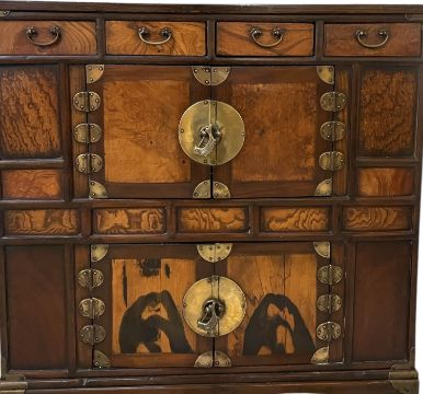 A Korean inspired hardwood and veneer cabinet chest. The specimen cupbaord having a curved top over a series of drawers and cupboard spaces throughout. brass handles, hinges and mounts. All raised on shaped bracket feet.